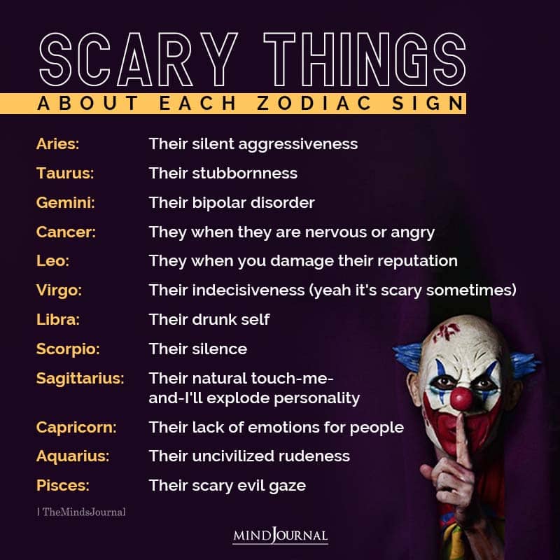 And sometimes Pisces can overexert himself in the pursuit of trying to fix everything, which only ends up hurting the water sign. 17 Fun & Weird Psychological Facts About Zodiac Signs Cancer Is Obsessive In Relationships. Namaste. Or find Pisces on Tinder. Scorpio tends to be quiet and mysterious. 2023 The Fact Network Ltd | All Rights Reserved |. Those born under the zodiac sign of Pisces are often artistically inclined and creative. Sometimes, music can make them sad, and other times, happy. [Vote now in our 2023 Readers' Choice Awards Poll]. Pisces natives can also be quite indecisive at times, struggling to make decisions. Its not an exaggeration that every person has a darker side and that not everything is sunshine. Not all Gemini-born people use their duality to bend the truth to fit their version of reality, but many do. Many Pisceans also enjoy bright and bold colors, such as pink or purple. Your sign is liquid and will in general be thoughtful to the dark horse. She studied English Literature at university and enjoys sailing & playing the piano in her free time. The star sign of Pisces is characterized by two fish, each swimming in a different direction. The creepy side to a Libra is how much he knows about everything, especially darker topics. There are times when Pisces get extremely pessimistic, especially when things don't go the way they had planned.. Taurus had a crush on Cancer a week before dating Pisces Scorpio secretly has feelings for Virgo Aries and Aquarius are sisters Ophiuchus and Pisces . So just what is going inside that dark Scorpio mind? What Should You Do If You Keep Seeing The 1047 Angel Number? Unlike the other signs, Pisces is the least dangerous water sign. Scary Facts About Zodiac Signs - Encyclopedia of Facts What Does It Mean To See The 760 Angel Number? Pisces love music and have a strong connection to it. Pisces Facts - The Least Dangerous Water Sign - Curated Magazine This story symbolizes Sagittarius ability to take down enemies with precision and strength. The zodiac sign of Capricorn is one of the most feared signs in the sky. And, there's nothing wrong with setting them free either. They are very comfortable opening up about their emotions. Shutterstock. Pisces Facts The Least Dangerous Water Sign, Cancer Zodiac Facts Personality Traits of the Sensitive Cancer. Emotions are irrational, and sometimes Pisces doesn't know how to cope with them. You should probably start counting your days and finish that bucket list before its too late. . Did you know that the Pisces star sign is characterized by two fish, each swimming in a different direction? The Pisces man is very close with his friends and family, and they often spend a lot of time together. If you're a Taurus, you already know that you can be stubborn AF. 15 Strange Myths & Facts About The Pisces Zodiac Sign You Should Know (Even If You Don't Believe In Astrology) This will provide them with security in the relationship and their partner. Libra doesn't understand why everyone isn't interested in this information, and after a few awkward interactions they might choose to keep their secret internet behavior under wraps. 2023byTango Publishing Corporation All Rights Reserved. These signs manifest themselves through a great deal of thinking. Other times, hes quiet because hes thinking about violent thoughts and brutal murders. Im sure everyone, not just Pisces, knows what this feels like when you are giving too much of yourself that you become irritable and sad. These scary and creepy facts about each zodiac sign are an interesting read. Pisces is the most spiritual sign of the zodiac and can often be found working as psychics or mediums. To date, a Pisces is to find someone who will bring out the best in you (and the worst). The creepiest thing about an Aquarius is that he probably already has a eulogy written for all of his loved ones. Why Do I Keep Seeing The Angel Number 1537? Pisces Zodiac Sign Facts Personality & Traits The Pisces belong to the twelfth house of the zodiac sign where the cycle of the zodiac ends and begins. OK, now for your creepiest trait because knowledge is power, and this might actually make for a pretty fun happy hour discussion. Creepy Facts About the Zodiac Signs - YouTube Scorpios are often feared because they are passionate and intense. Pisces are known for being loners, and Geminis are known for their charmtwo characteristics commonly found in serial murderers. That said, Pisces don't handle criticism well. That is where they pour their imagination and create special worlds. "This woman is a lady in the streets but a freak in the sheets. The most creepy thing about a Sagittarius is that under all that optimistic, friendly nature, he doesnt feel emotion. Cancer: They when they are nervous or angry. Well, what's wrong with that? Pisces get you, they know how you feel, they do not judge you, and will always listen to you. Pisces is a completely different person when she's alone. retailers. Your California Privacy Rights. In order to fully understand the key characteristics and traits of the Pisces personality we first need to reflect on the key elements that make up the Pisces star sign . The most important thing any man needs when dating a Pisces girl is patience don’t rush things because she’ll feel pressured and not give in to anything at allwhich will only drive them away faster than if they were just given some space. Why Do I Keep Seeing The Angel Number 1963? Scary Things About Each Zodiac Sign - Themindsjournal.com And those are all roles with the 12 different signs of the zodiac. Read more: Leo Zodiac Signs: Personality Traits, Love Compatibility, & More Astrology. Pisces zodiac signs find it difficult to keep things bottled up. For a Pisces, the heart comes before anything else. Detailed astrology analysis and forecast on Career, Income, Health, Love and Marriage. Just being in the water makes them happy. Finally, research has shown that people with Can