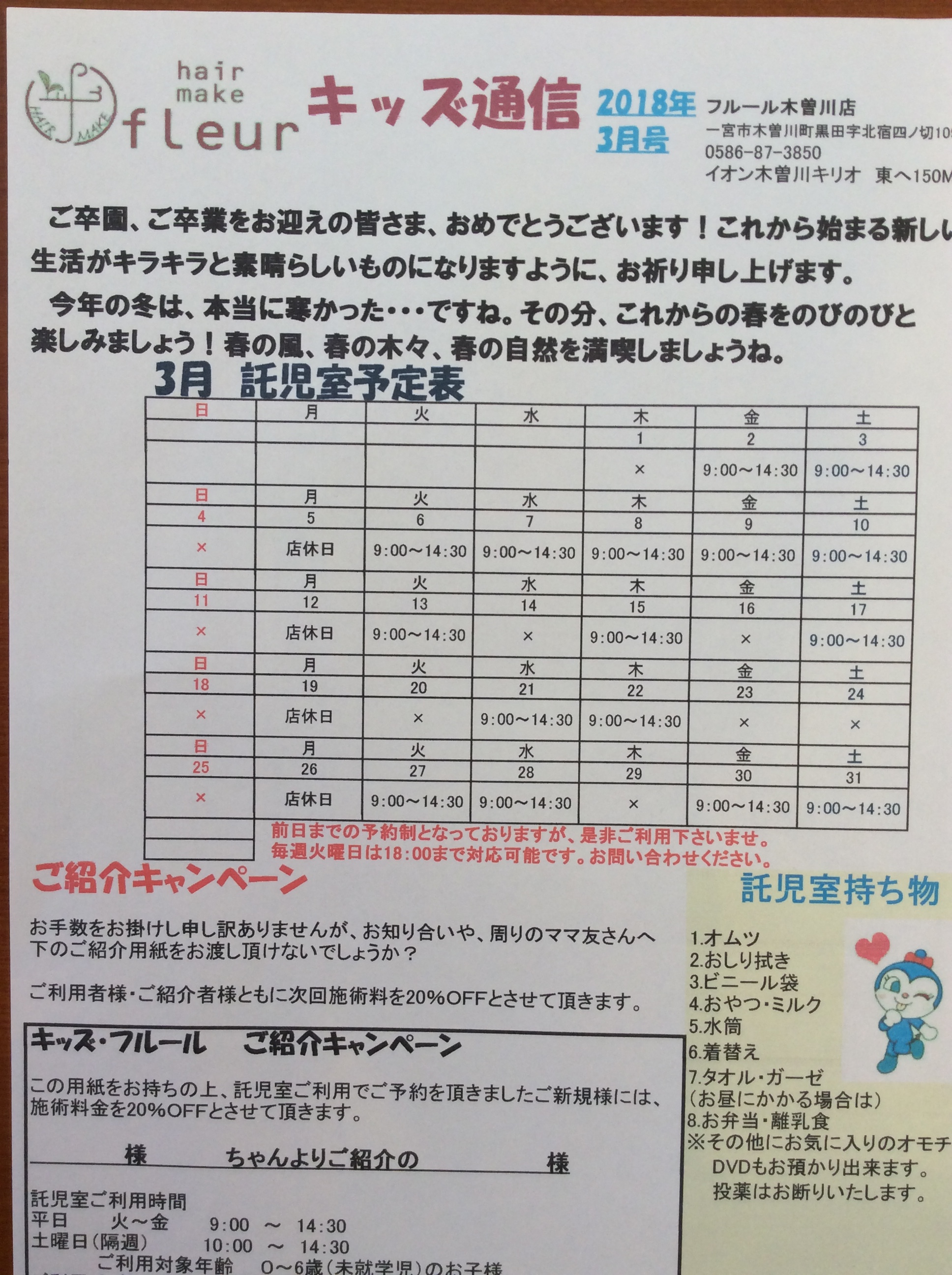 3月のキッズ通信が出来上がりましたので、画像でアップいたします。