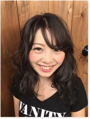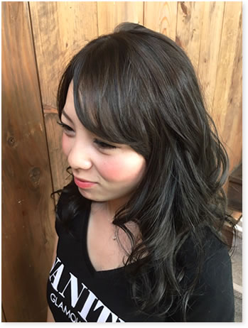 7LVのブルーアッシュでつや感とやわらかさをだし、“大人”と“可愛い”の両方をかねそろえたスタイル。